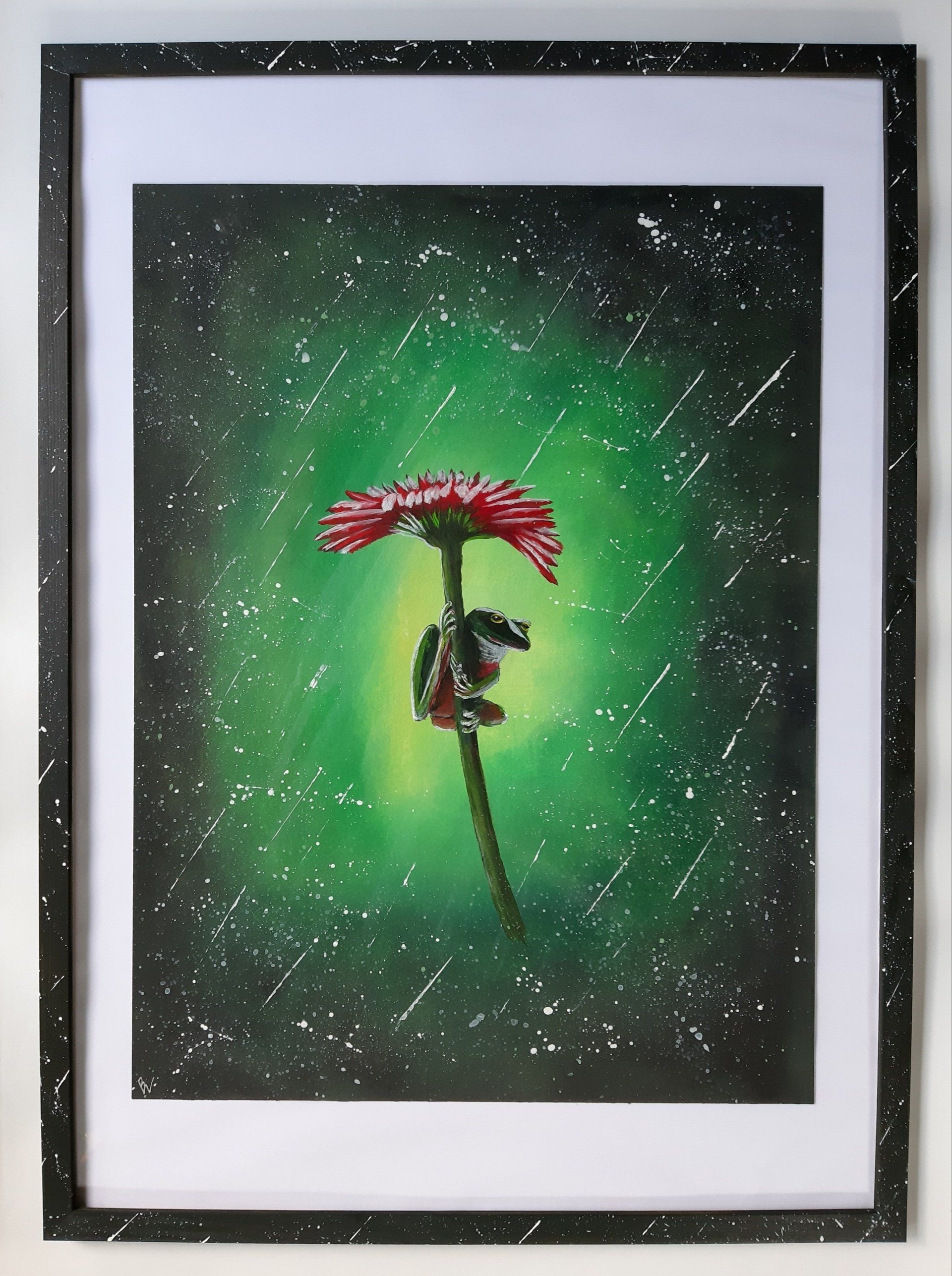 Fröschle im Regen (nach einer Idee von Dranitsin) (42x56) mit Rahmen (Außenmaße 53 cm x 73 cm) 245 €