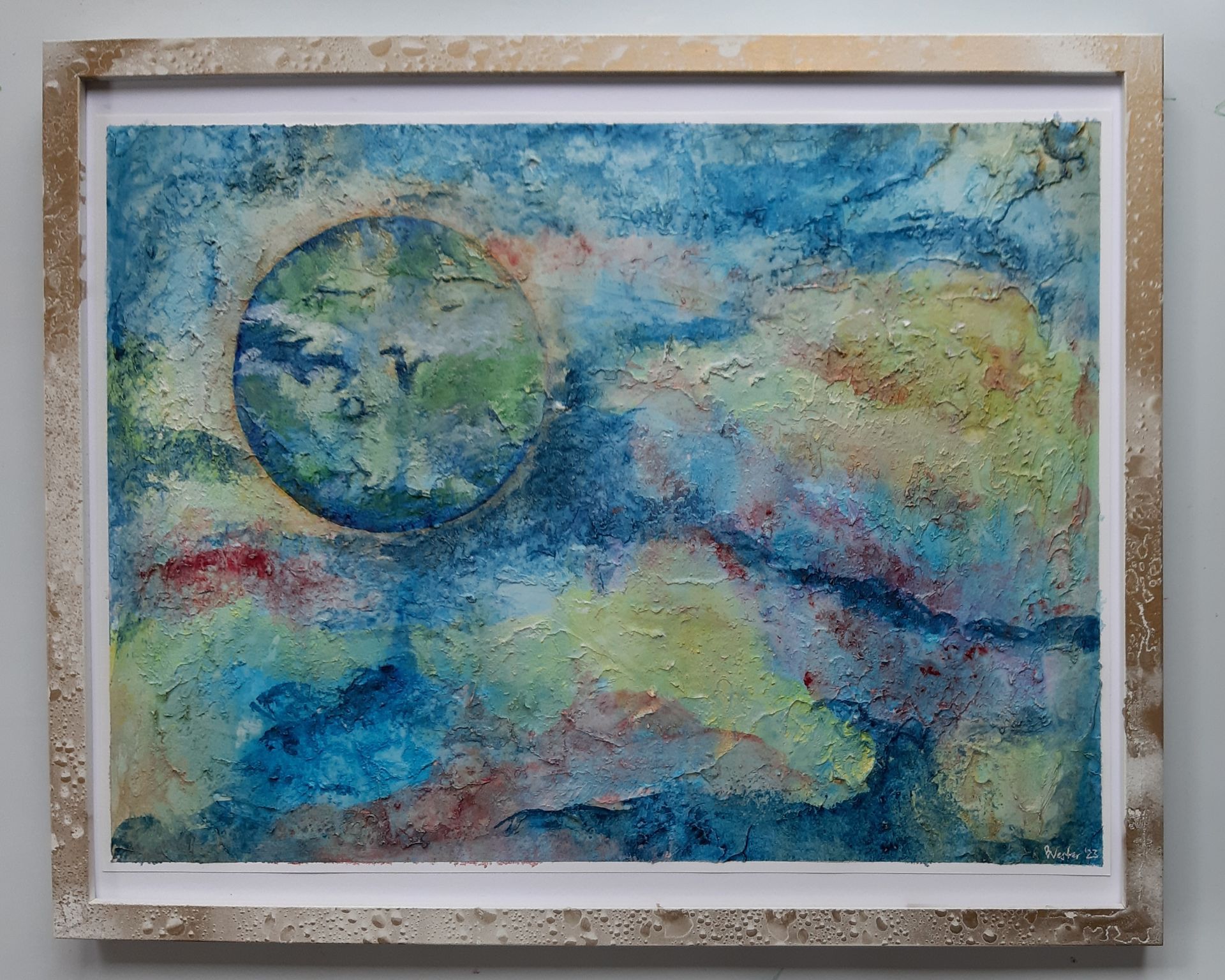 In den Tiefen des Alls (Spachtelmasse auf Papier) 36 cm x 48 cm mit Rahmen